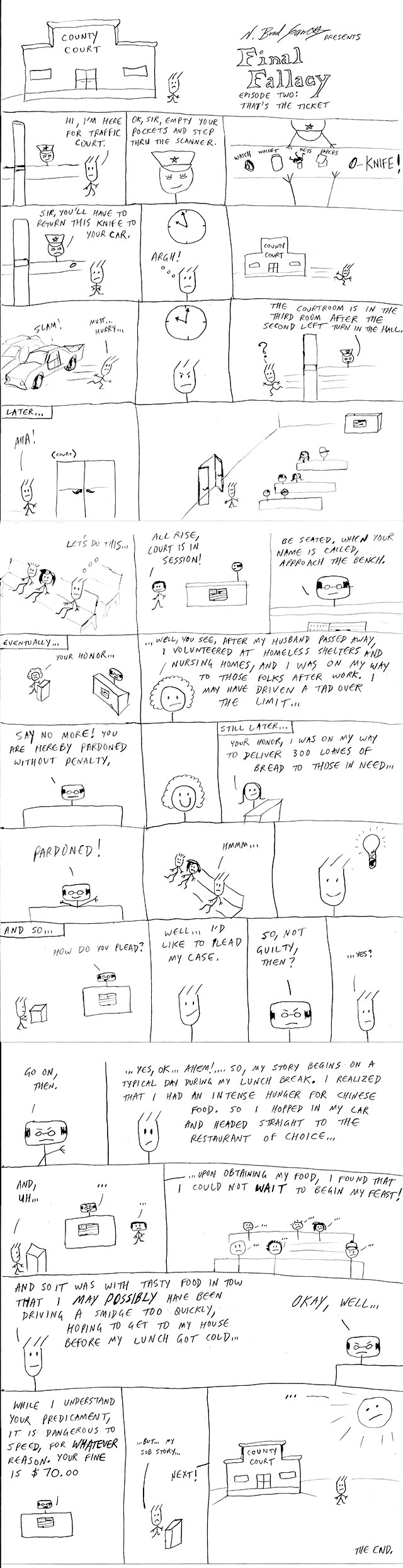 Today I am unleashing the first episode of my web comic, Final Fallacy. These strips will incorporate the stick-person style that I employed back in the day for my high school paper, and will be based on actual occurrences in my daily life (and perhaps others’ lives as well). Hopefully I can do one of these at least twice a month, but we shall see. Enjoy!